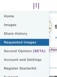 TO REQUEST IMAGES from patients, select “Requested Images” from the drop-down menu located at the top left corner of your dashboard (home screen).