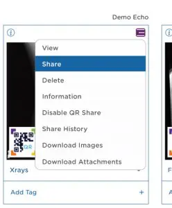 Select “Share” from the menu located at the top right corner of a study on the dashboard or anywhere the icon is displayed. Images can be shared with colleagues and patients, with or without a mymedicalimages® account.