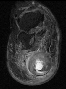 On physical examination. There were three distinct masses in the foot, a small mobile mass over the dorsal and lateral aspect of the foot that was tender to palpation and in the subcutaneous tissue. A second mass was in the medial hindfoot; it was deep and non-mobile. The third was on the plantar foot. It was deep, fixed and tender to palpation.