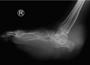 AP, Oblique and Lateral radiographs of the foot show multiple soft tissue densities specifically in the hindfoot (retrocalcaneal region) and the plantar aspect of the foot. In addition, there are erosions in the calcaneus, talus and midfoot.