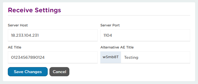 Step 4: You will be taken to the Receive Settings page. This page will show you the information for server host, server port, as well as your default AE title.